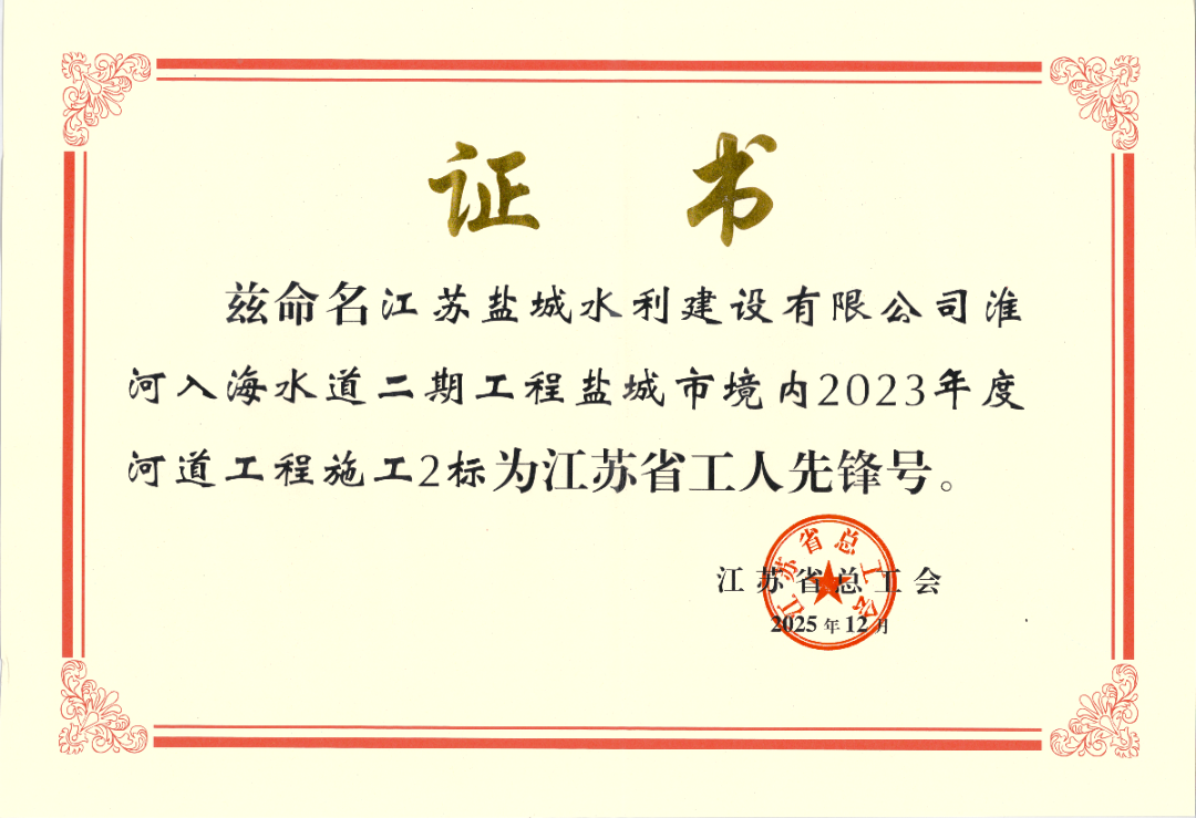 喜报!我公司承建的淮河入海水道二期工程盐城市境内2023年度河道工程施工2标项目荣获“江苏省工人先锋号”称号。该荣誉是对项目部全体工作者实干担当、攻坚克难、履职尽责的充分肯定,将进一步激励全体盐城水建人凝心聚力、奋勇争先、再创佳绩。